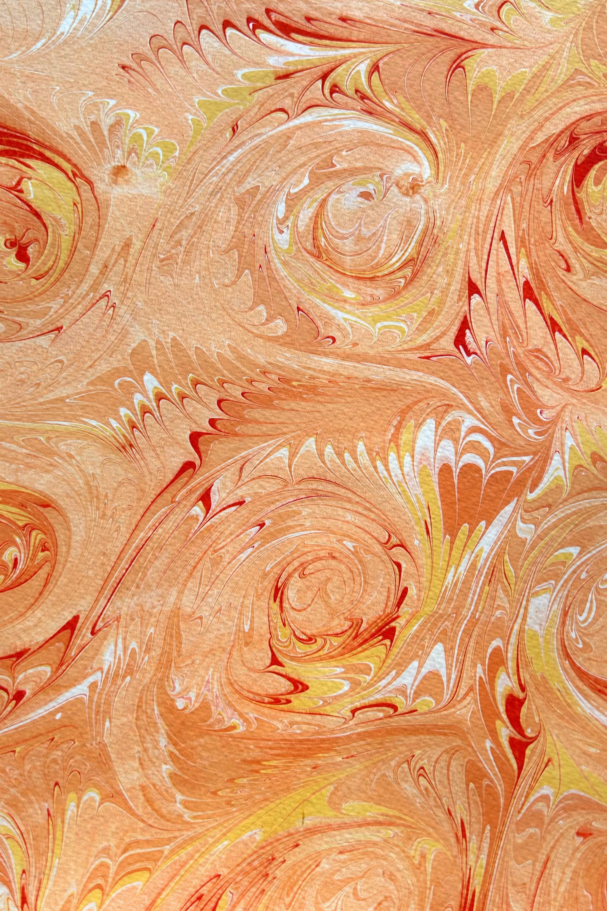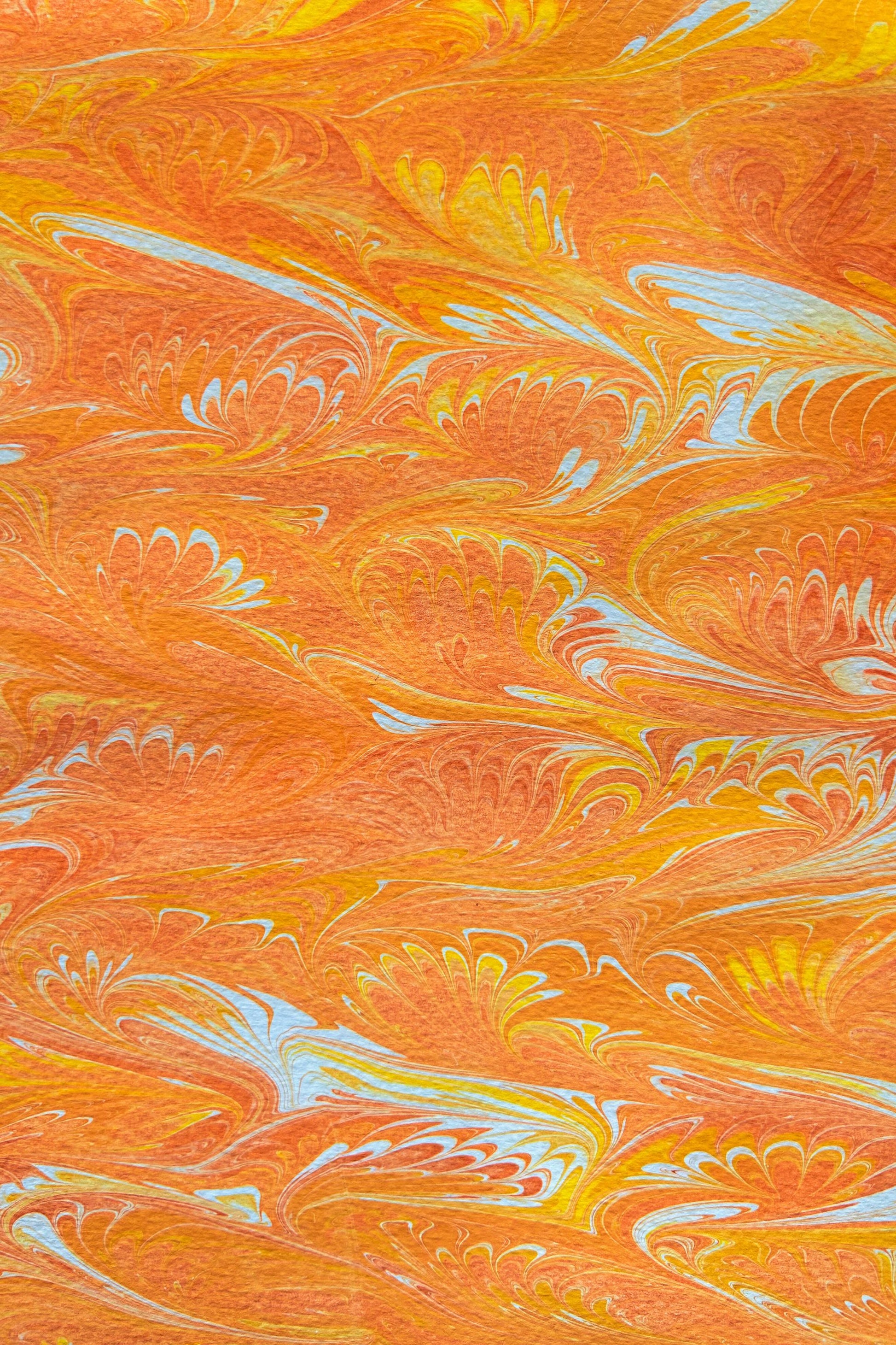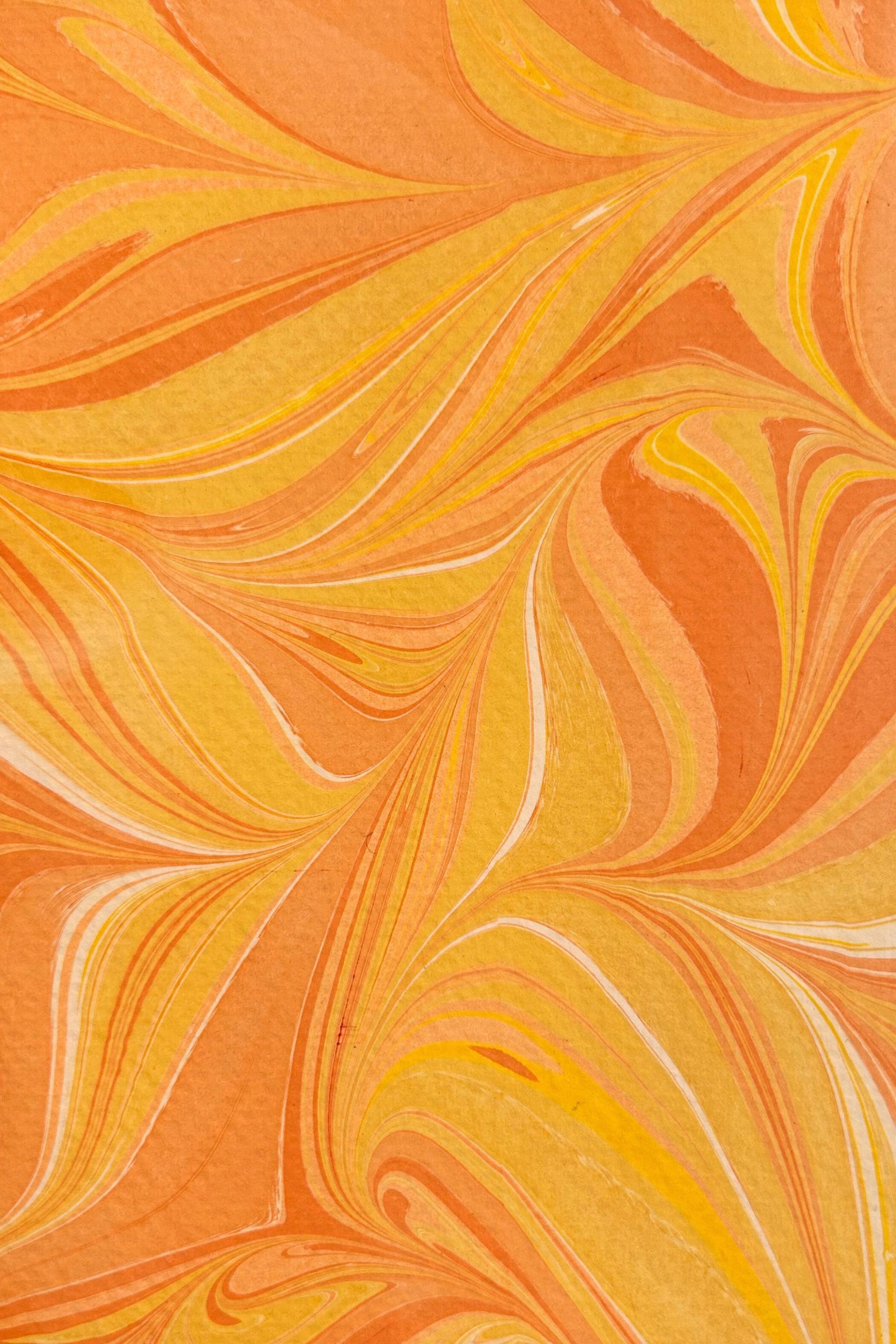 Five folded marbled cards in sunny yellow and orange tones. Cards are hand printed on heavy 300 gsm finely textured cream coloured paper and each measures 10 x 14.5 cm. Design and colour varies from batch to batch.