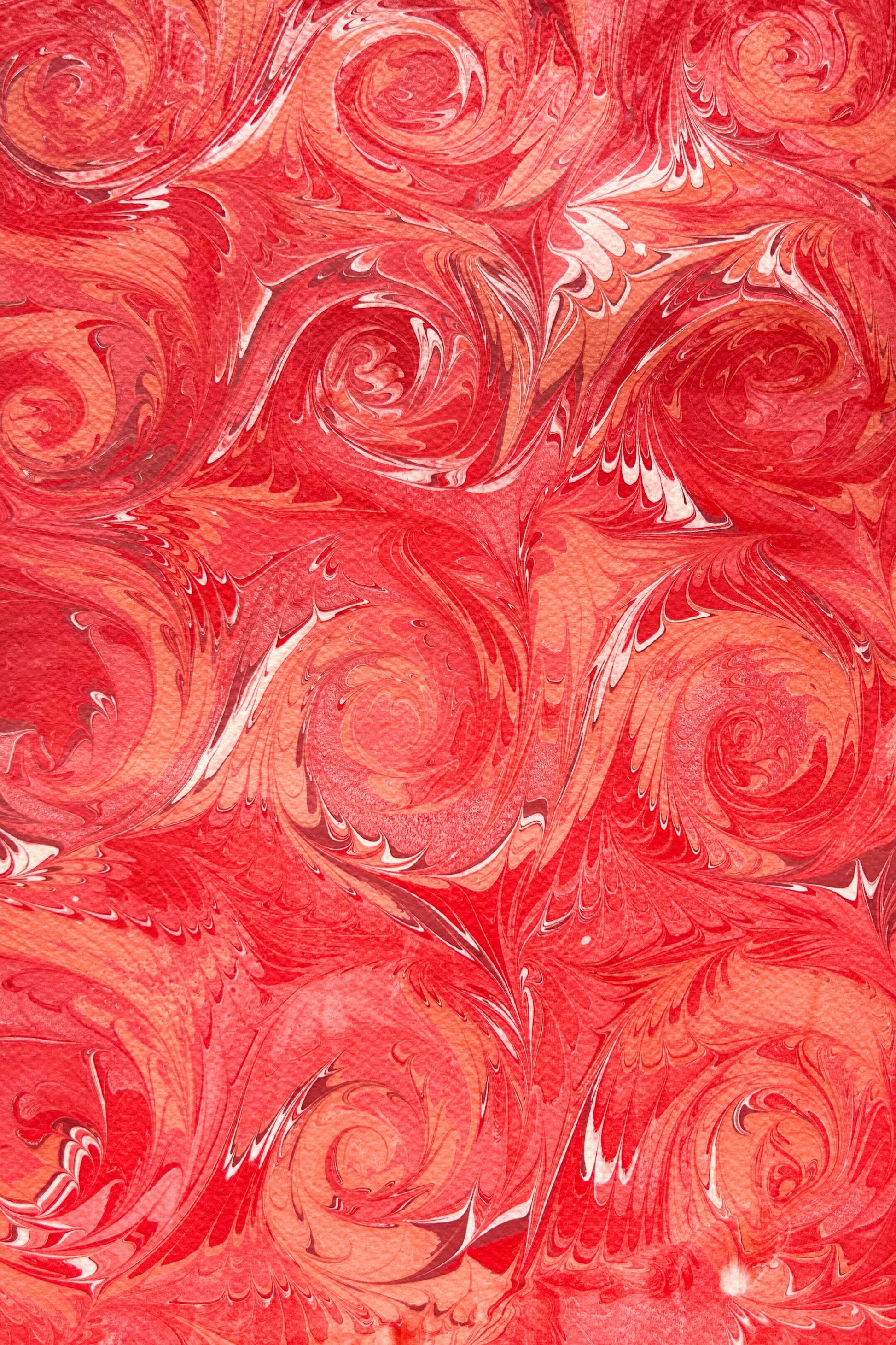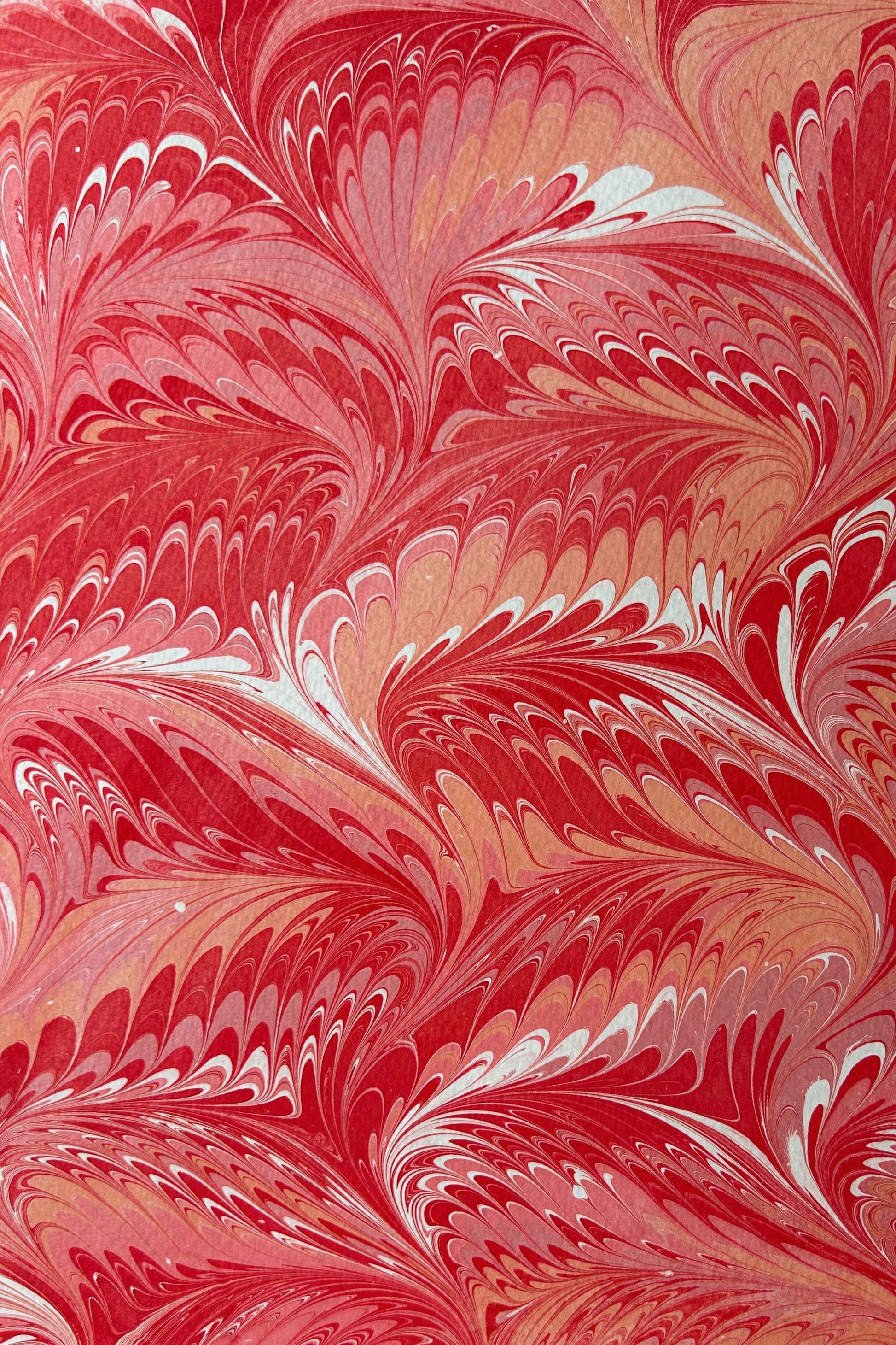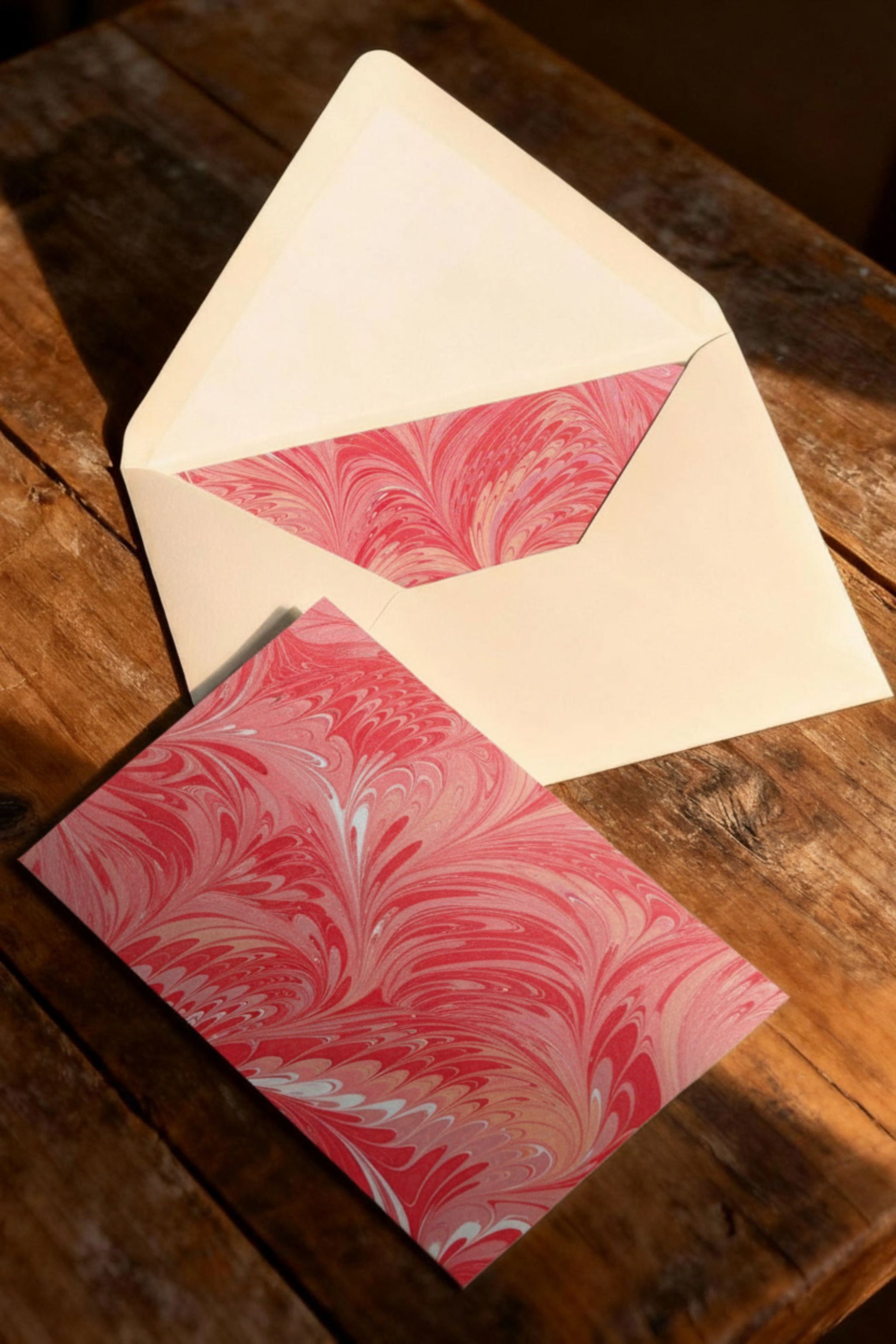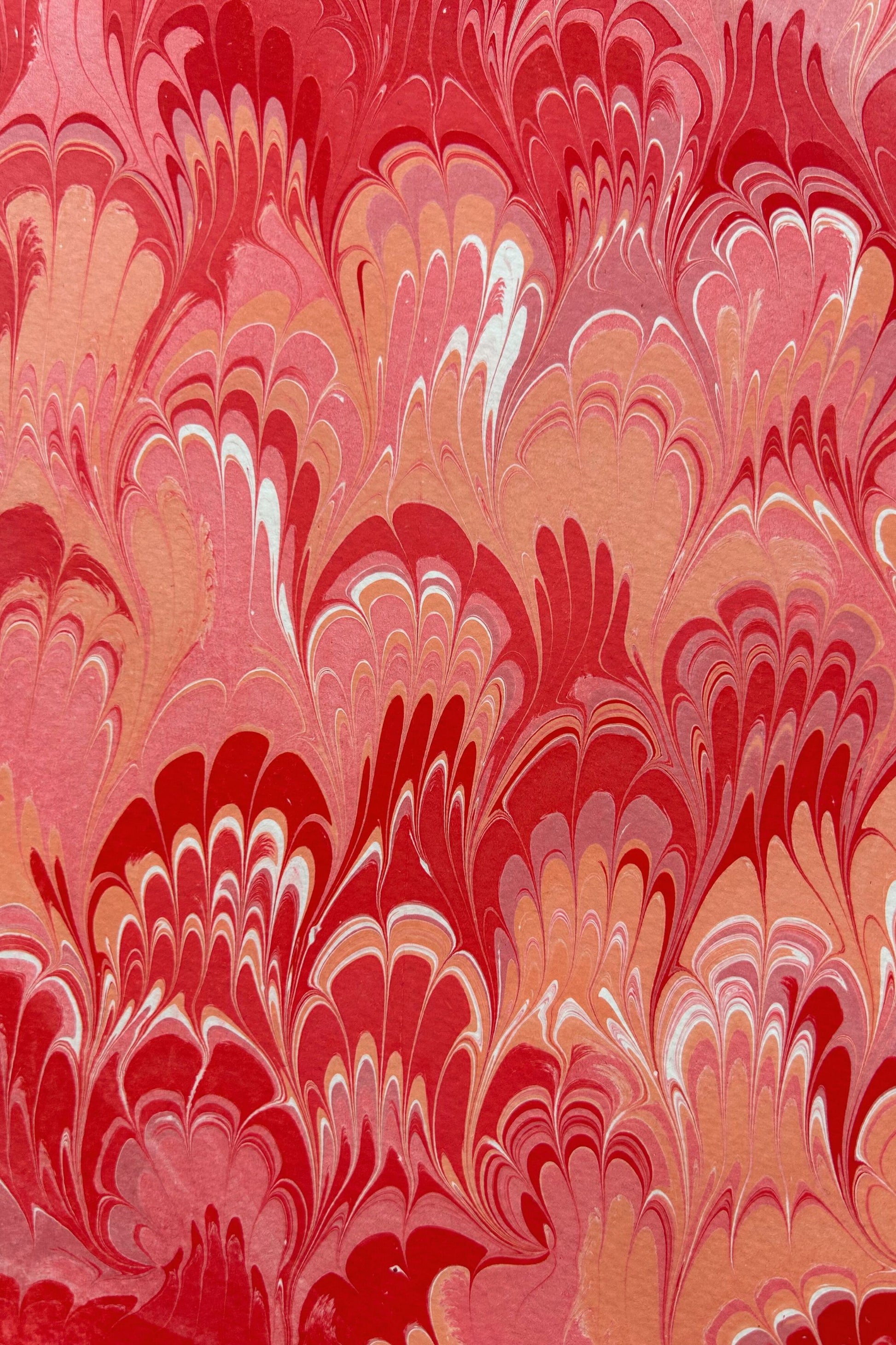 Five folded marbled cards in red tones inspired by the Provencal town of Roussillon with its red and ochre colours. Cards are hand printed on heavy 300 gsm finely textured cream coloured paper and each measures 10 x 14.5 cm. Design and colour varies from batch to batch.